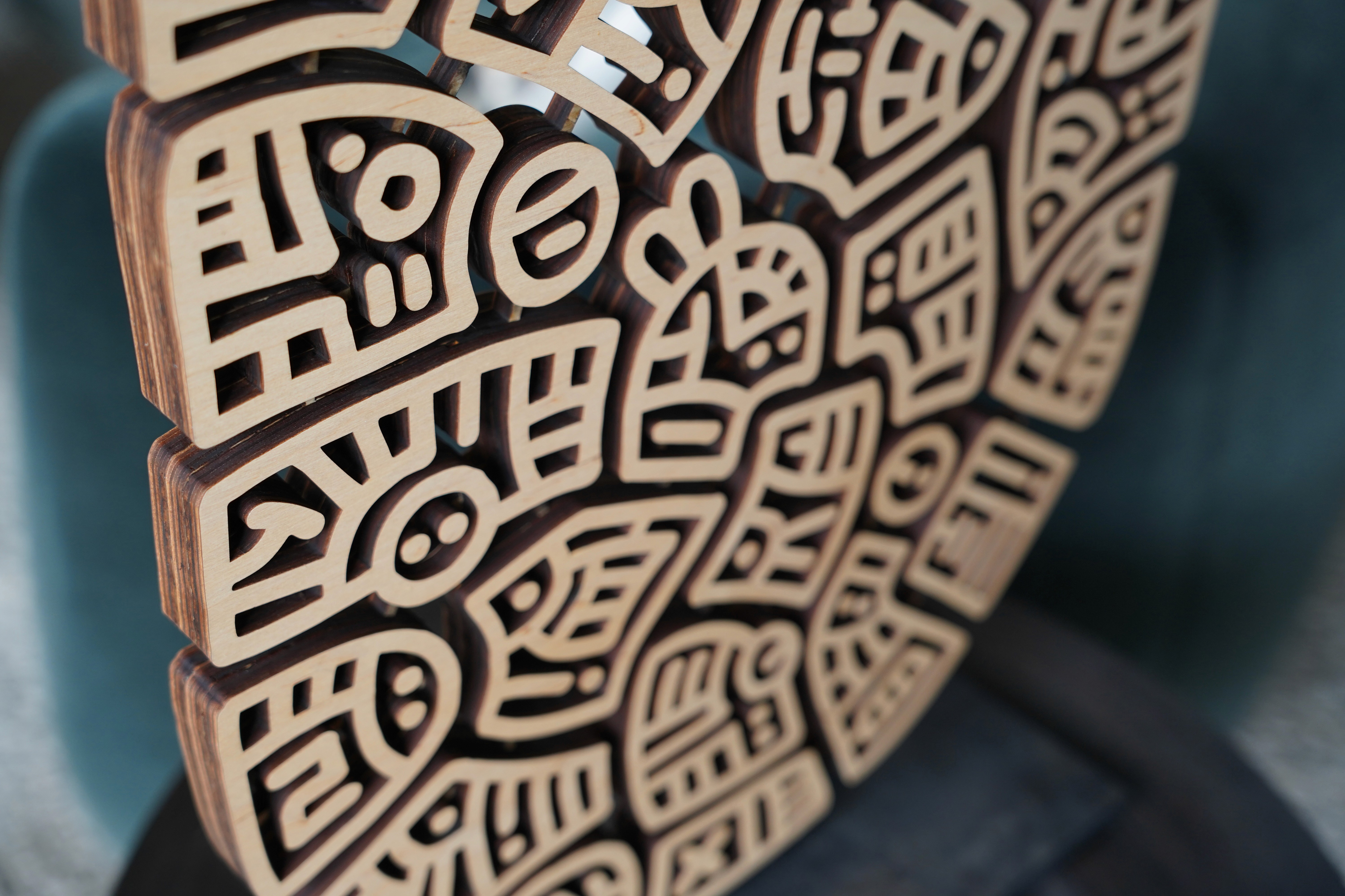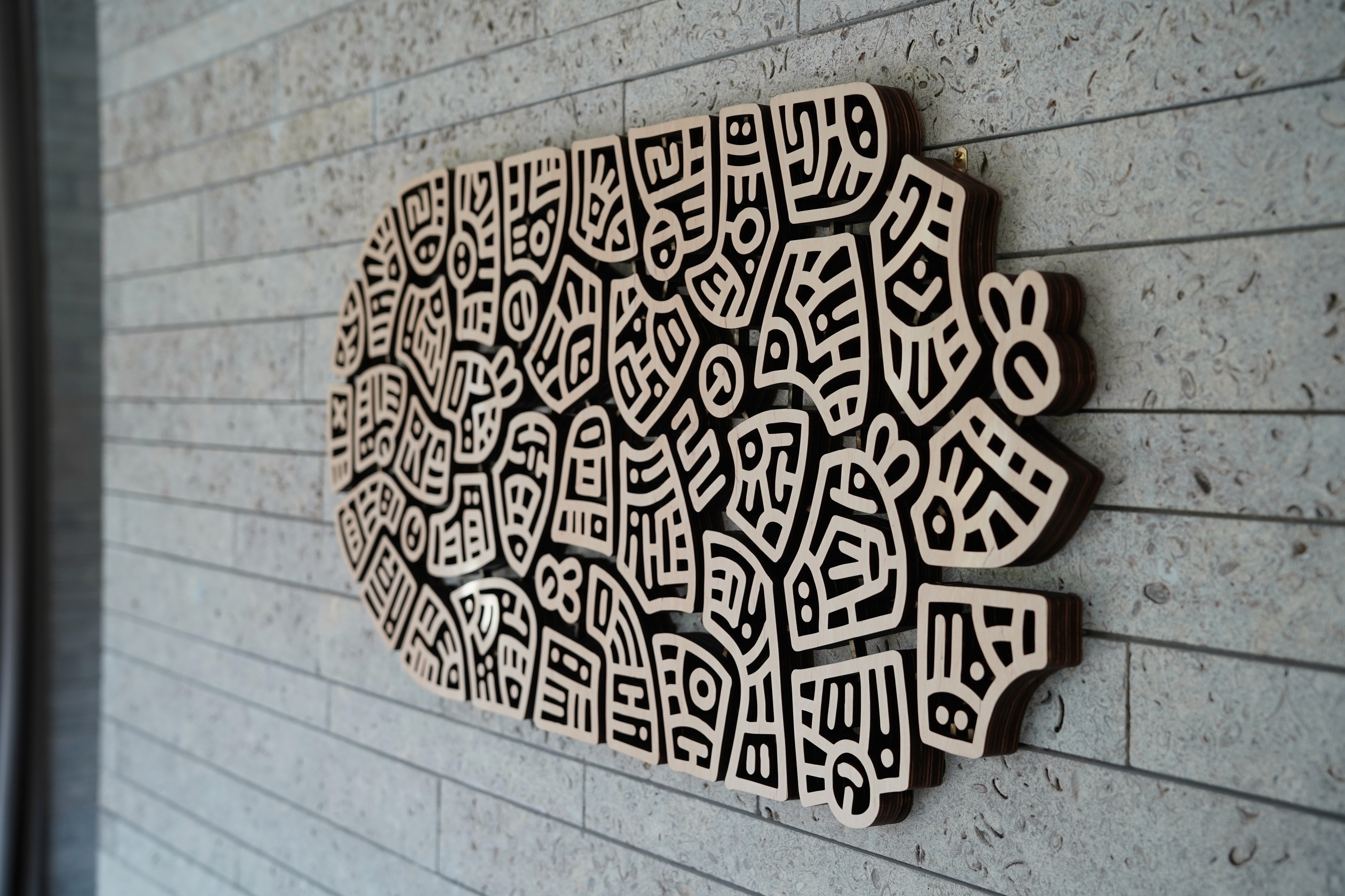 My process begins on paper, where the forms develop intuitively around a faint guiding line. It’s a visual language shaped by years of drawing. The design is then digitized and translated into a laser-cut pattern, where each mark becomes a precise cut in carefully sanded wood. Two hundred and forty-five pieces are hand-finished and assembled, building up three layers that create the final 18 × 36 inch sculpture.